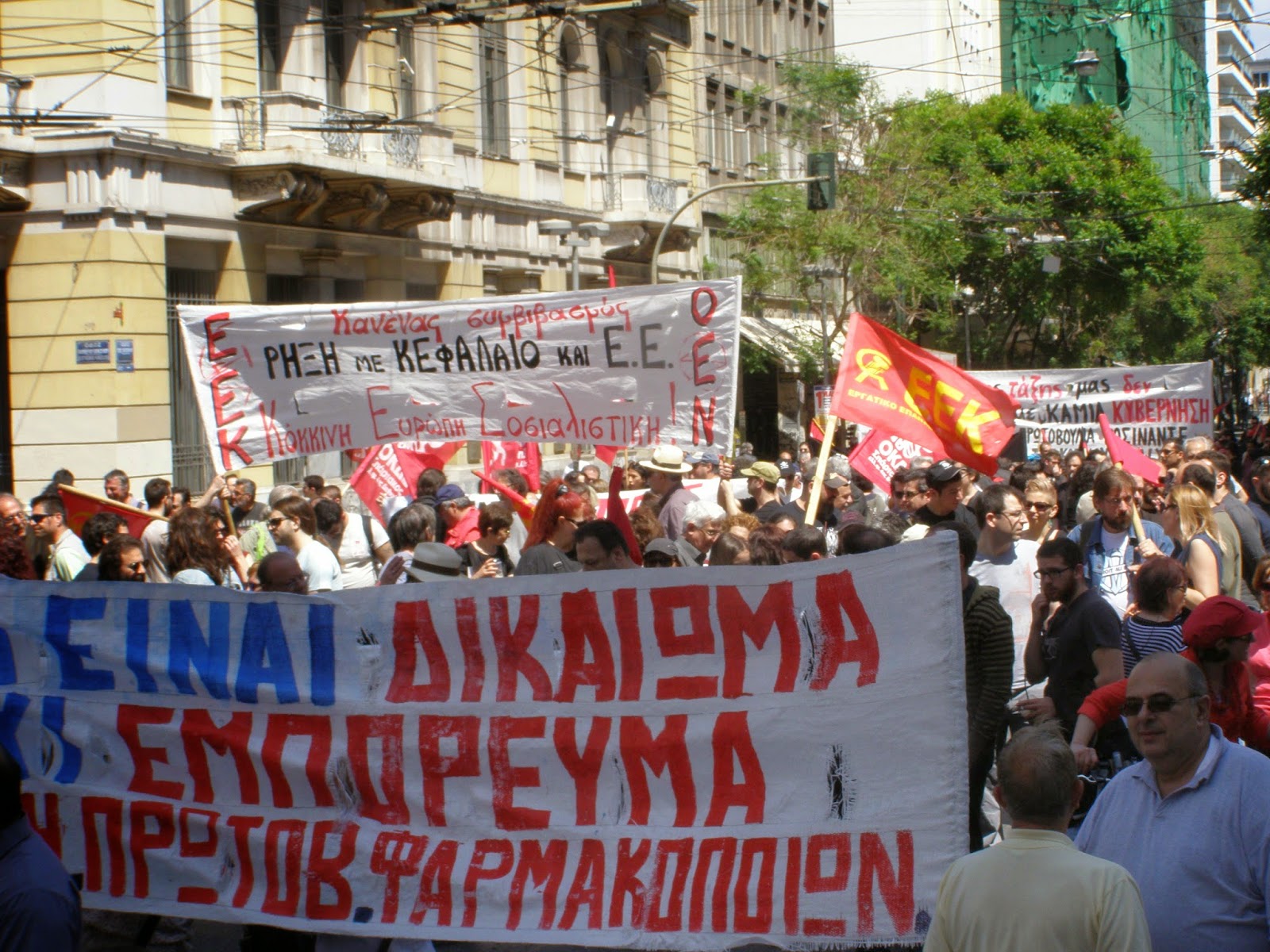 No compromise with the troika! Break with the EU and the capital! For a United Red Socialist Europe!, Cancel the debt!, We do not forget the martyrs of May 2, 2014 in Odessa-Smash fascism!, For workers power in Ukraine!, Our life is not a commodity, Victory to the revolt in Baltimore!, For a Balkan Socialist Federation!
